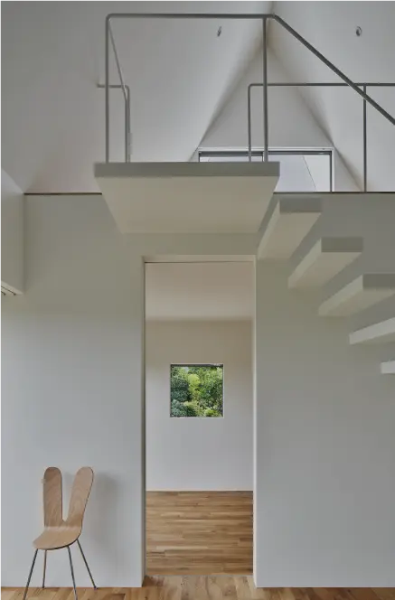 内装の壁をあえて一面の白で統一することで、光と陰影が際立ち、空間そのものの純度を高めました。その中に、壁から軽やかに跳ね出した木の階段を組み込むことで、白の静けさに温もりとリズムを添えています。 全ての部材は細かなパーツの積み重ねによって構 成され、ひとつひとつの精緻さが全体の美しさを支えるように計画しました。単なる構造ではなく、素材とディテールの繊細な対話から生まれる空間美を大切にしています。
