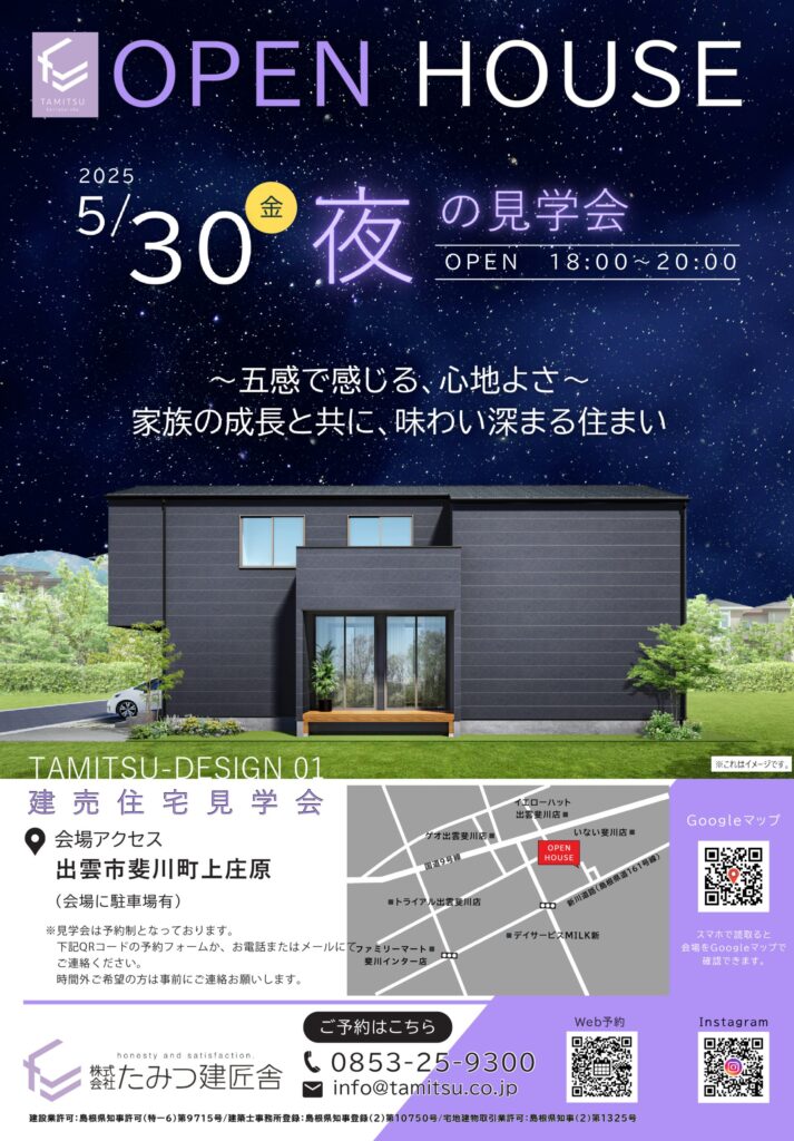 現在、5月30日(金)18:00~20:00にて夜の見学会の受付をおこなっております。