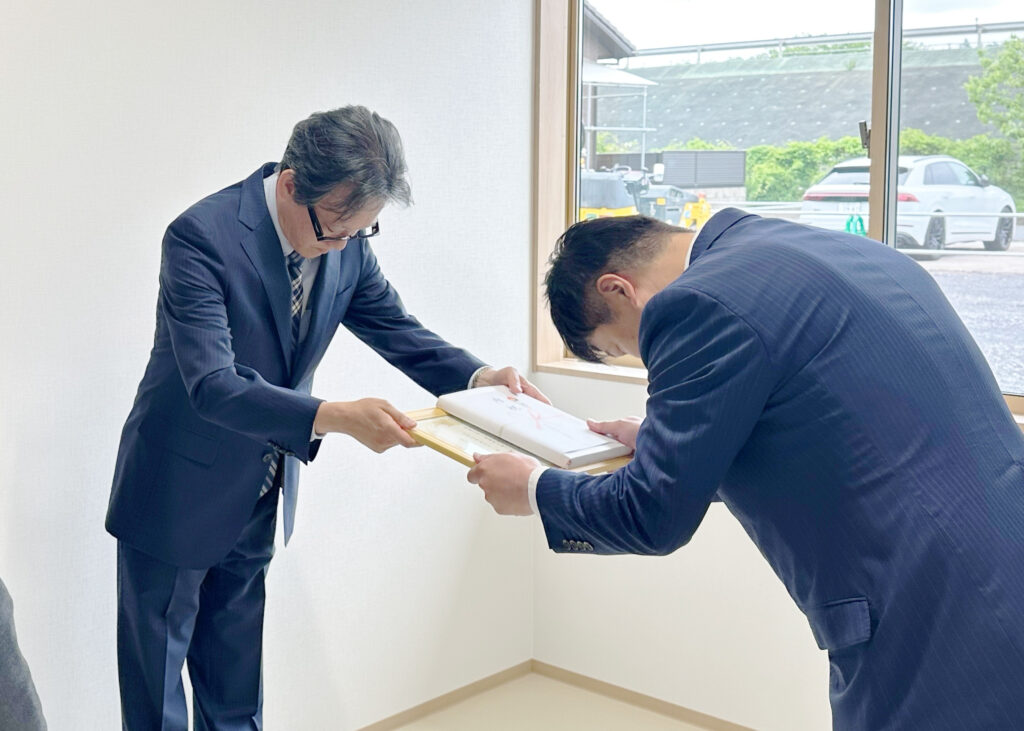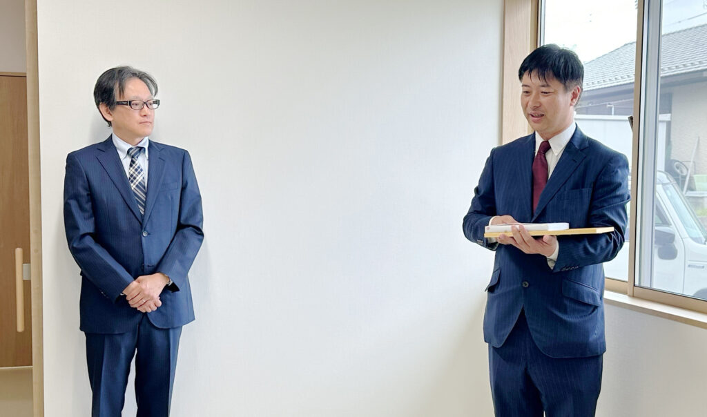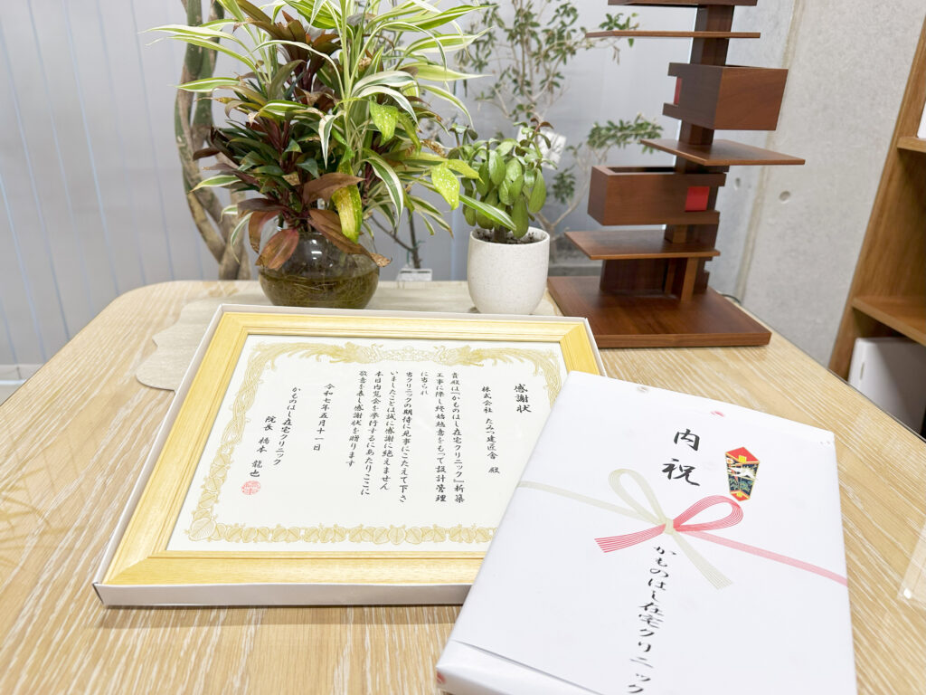 式典では院長の橋本先生より、当社代表・多々納へ感謝状とともにありがたいお言葉を頂戴いたしました。多々納からも、今回のご依頼に対する感謝の気持ちと、地域医療への期待を込めてご挨拶をさせていただきました。