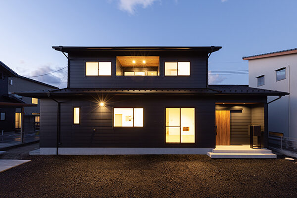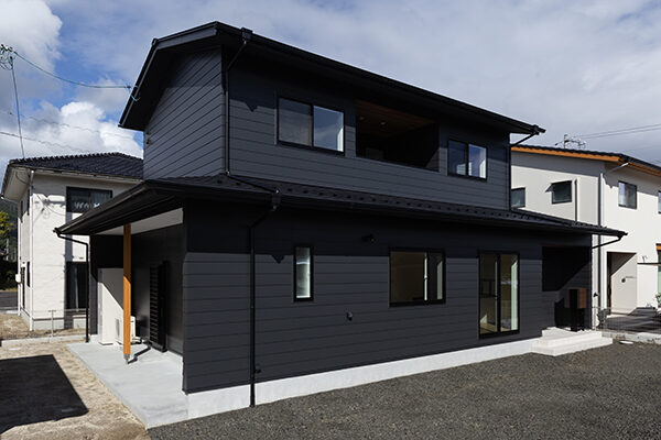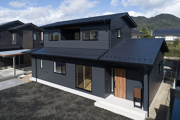 こちらは2階建ての住宅です。外壁に金属サイディング(※)を採用し、外観色はシックなブラックが基調となっています。アクセントで木材を使用しており印象を和らげています。