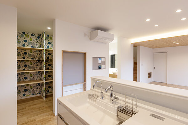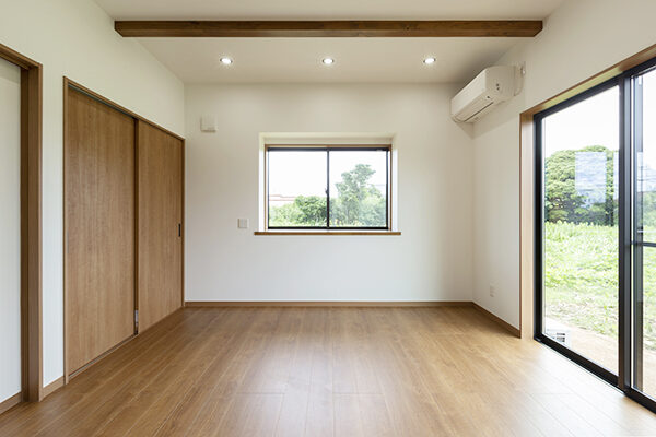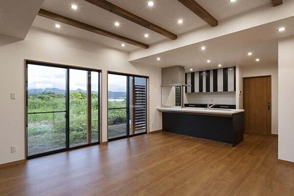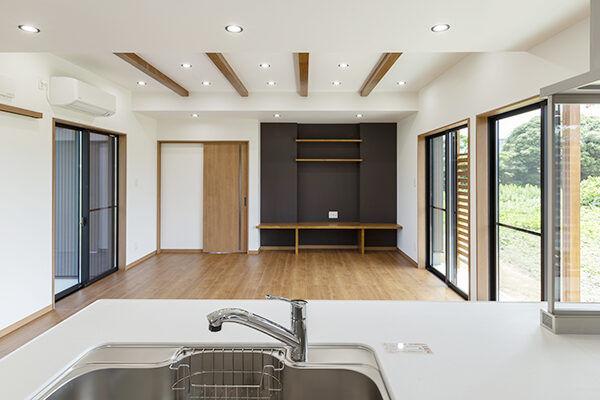 居室の天井には、あえて梁を見せることで、デザイン性と開放感を両立しました。天井を高く見せる工夫が、空間にさらなる広がりを与えます。