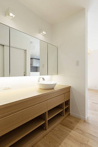 白と黒を基調としたモダンな空間に、木材の温かみが調和し、家族みんなが心地よく過ごせる住まいが完成しました。