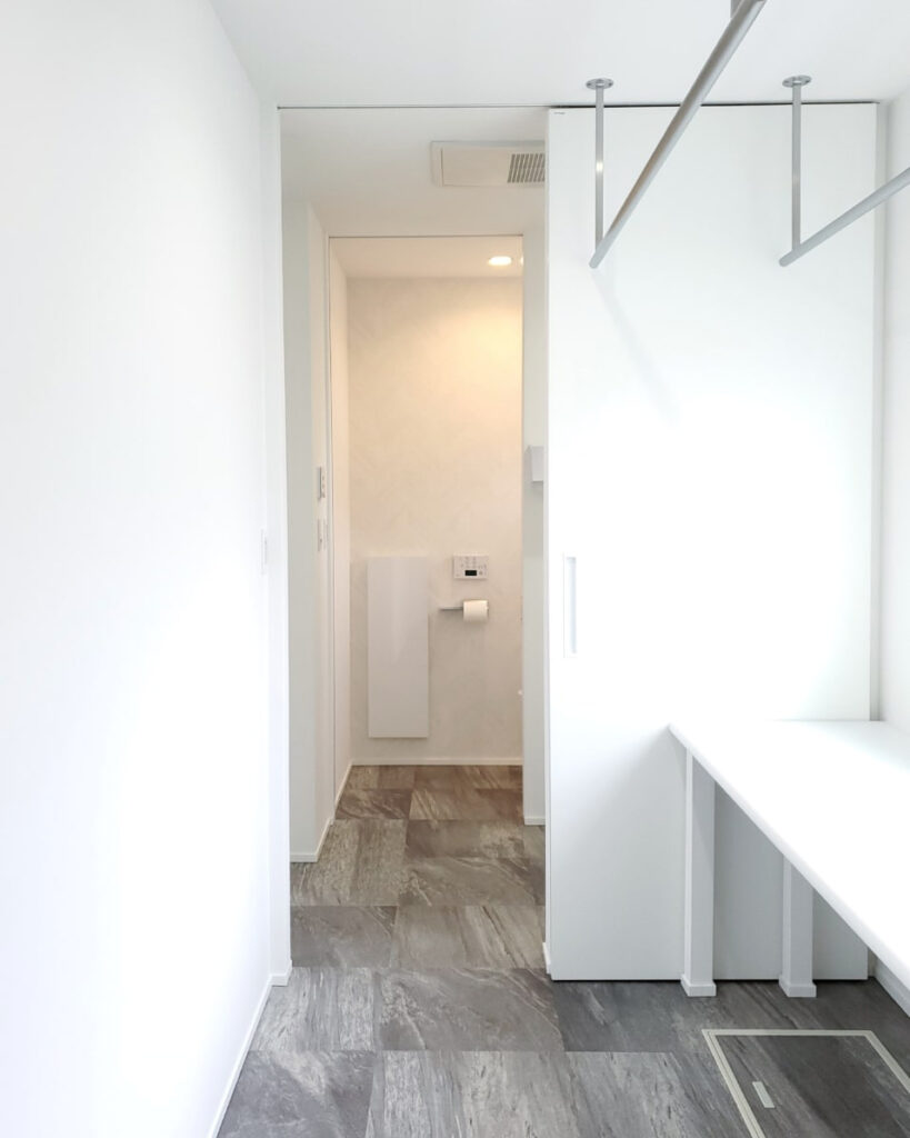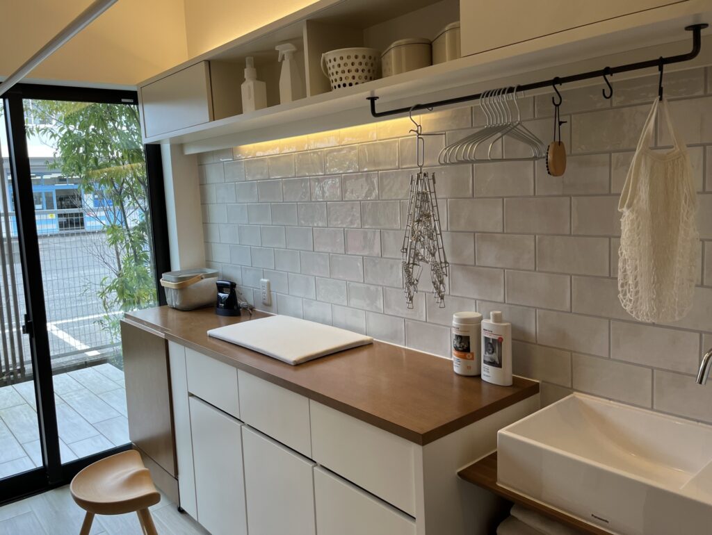洗濯機のそばに可動棚やハンガーパイプを設けると「洗う→干す→しまう」がワンルームで完結し、家事動線を大幅に短縮することができます。