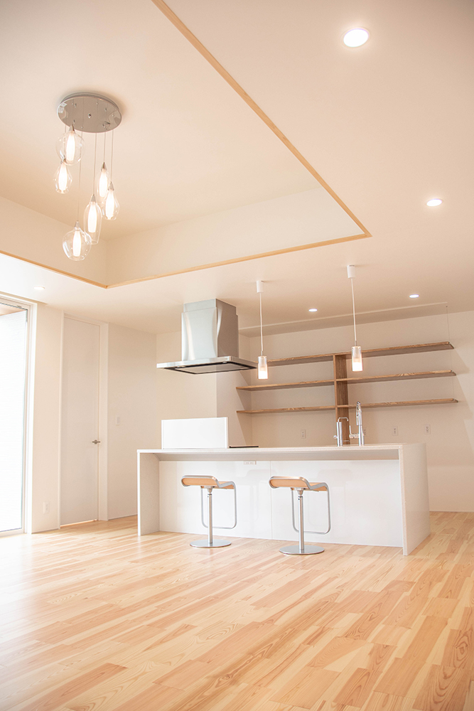 リビングの天井は一目惚れしてご購入されたという照明が綺麗に見えるよう、一部を上へあげています(折り上げ天井といいます)。