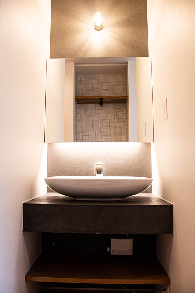 ほかには、洗面台にもこだわりがあります。「シックな雰囲気のお客様用の洗面台」と「使い勝手のいい家族用の洗面台」、2つに分けているのです。来客用の洗面台は生活感を出すことなくお客様をご案内できます。