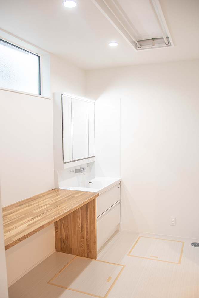 ↓こちらはご家族用。脱衣所にあり、収納が多く、使い勝手のいい洗面台です。