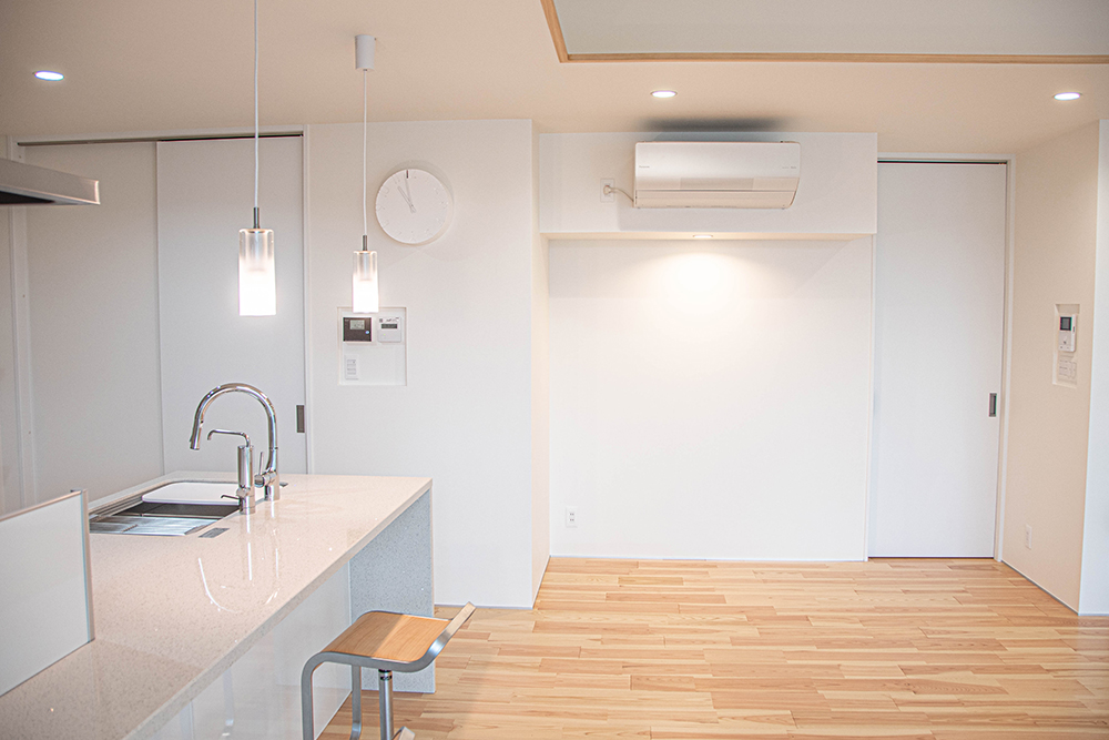 全体的に白を基調として、床も優しく明るい色の木材を使用しているためお部屋が広々と感じられますね。