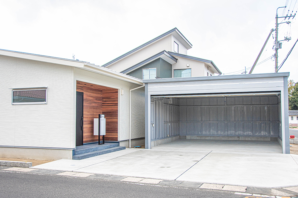 こちらのS様邸はガレージ付きの新築平屋建てのお家です。木目をアクセントにしつつシンプルにまとまった外観が特徴です。
