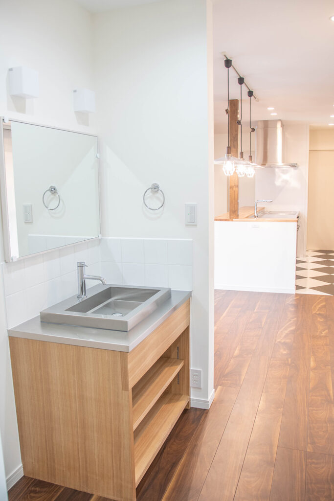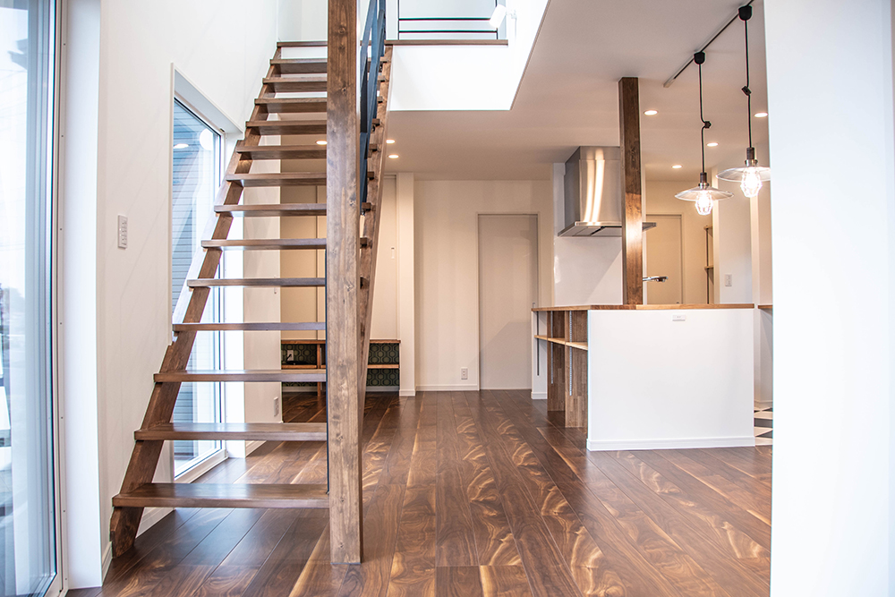 玄関ドアや木板のストリップ階段(※)、キッチンの一部床材など、さまざまな箇所にアクセントとして落ち着いた風合いの木材を使用しています。