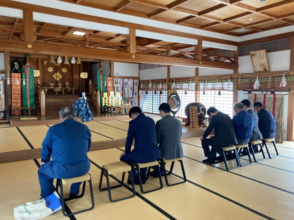 出雲大社にてご祈祷ののち、現地へ移動し施主様や関係者の方々とともに、厳かに儀式を執り行いました。ご神体に酒、米、塩、などをお供えし、神主さんの祝詞奏上やお祓いなどのあと、施主様をはじめ参列者が榊を捧げてお参りする、という流れです。