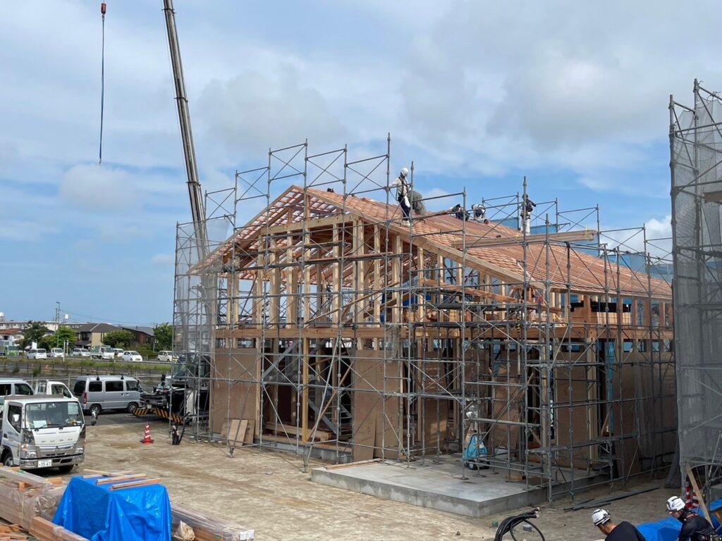 また、先日6月14日には上棟が行われました。こちらは柱や梁などの組み立てを終えて棟上げ(むねあげ)をおこなう、という工程です。